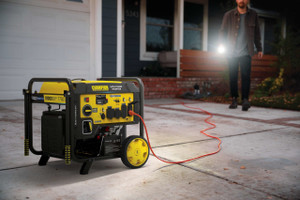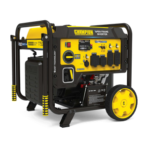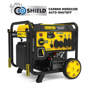 The Champion 10000 Watt Inverter Generator has a 12-hour run time and is transfer switch ready for home backup with 30-Amp and 50-Amp 120/240 Volt Receptacles. CO Shield automatically shuts the generator down if it detects unsafe levels of carbon monoxide.
